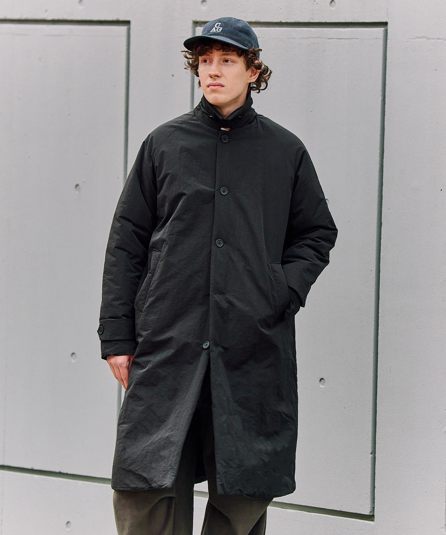 首回りには襟とチンストラップを配していますが、ボリュームのあるマフラーなどを合わせてアクセントをつけても良し。