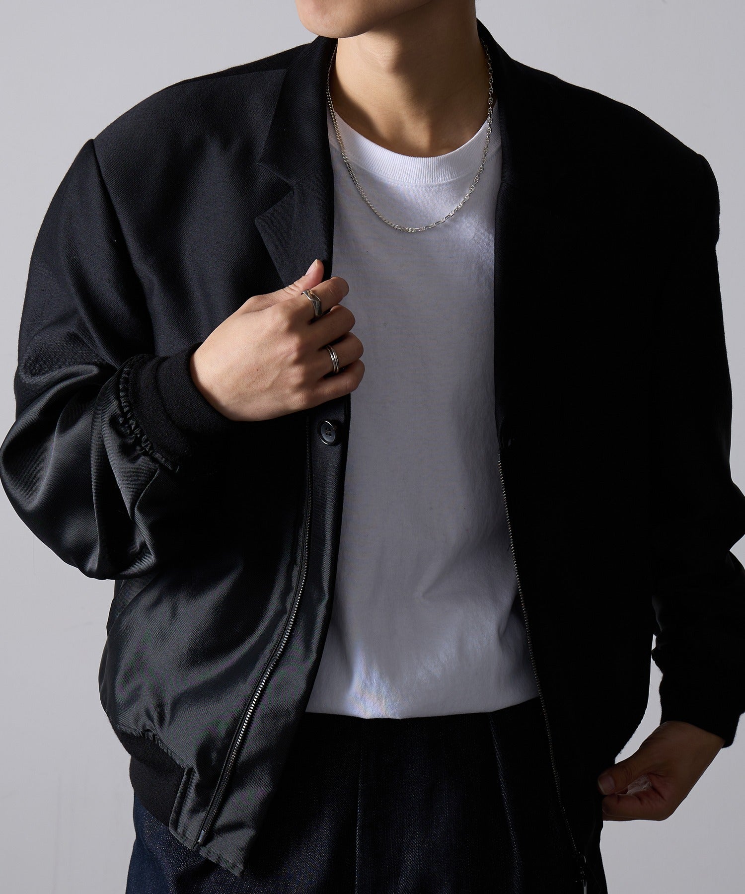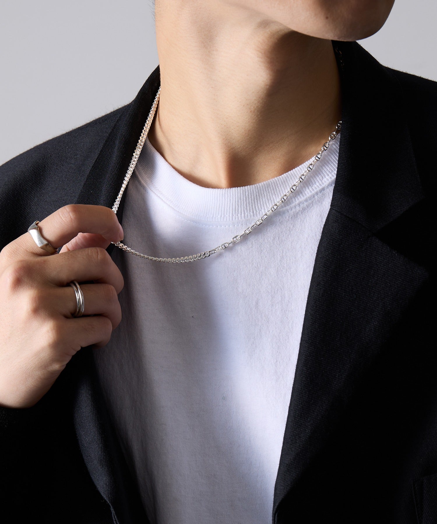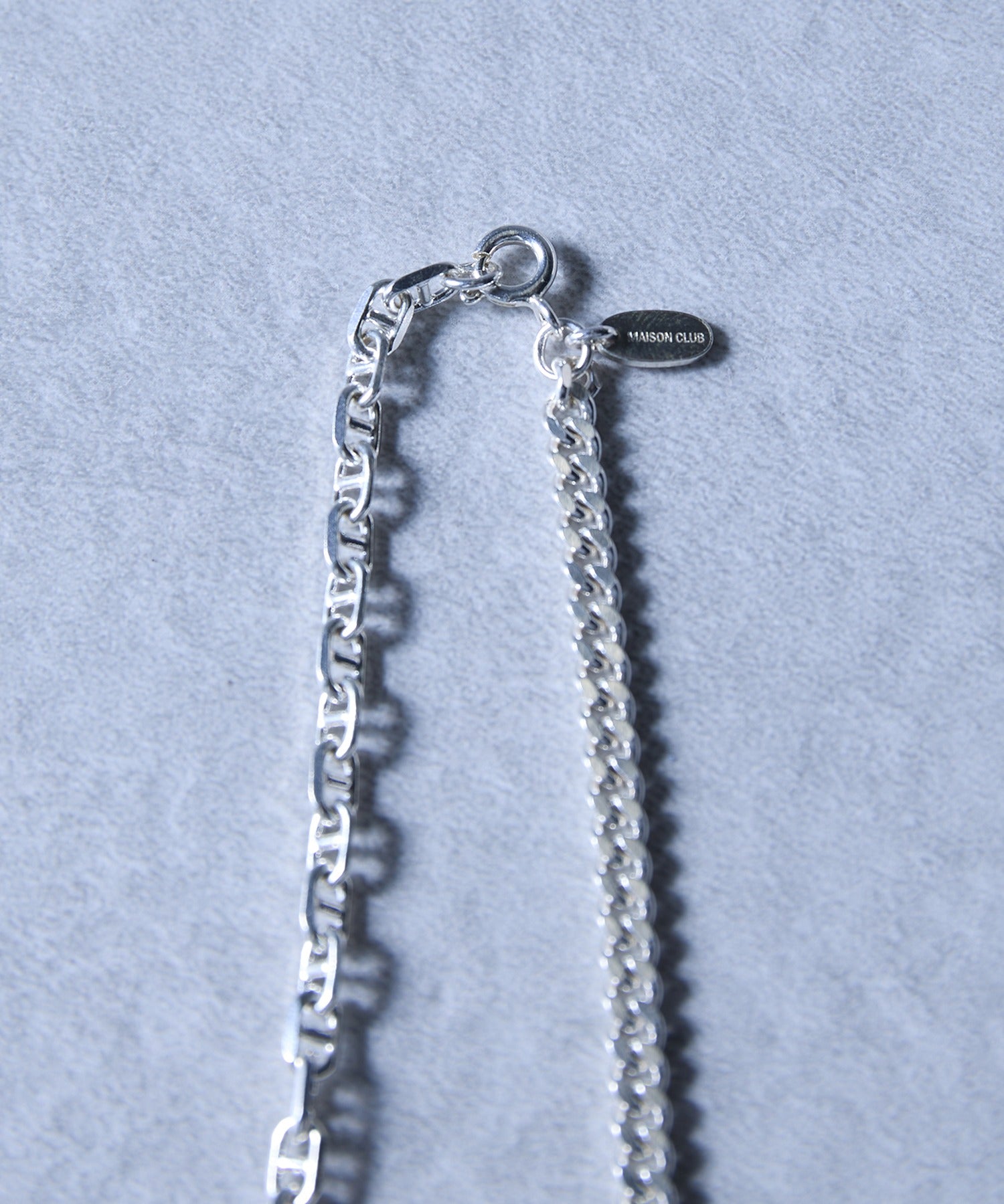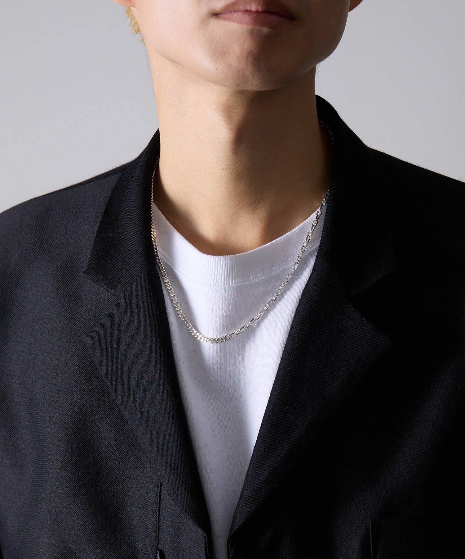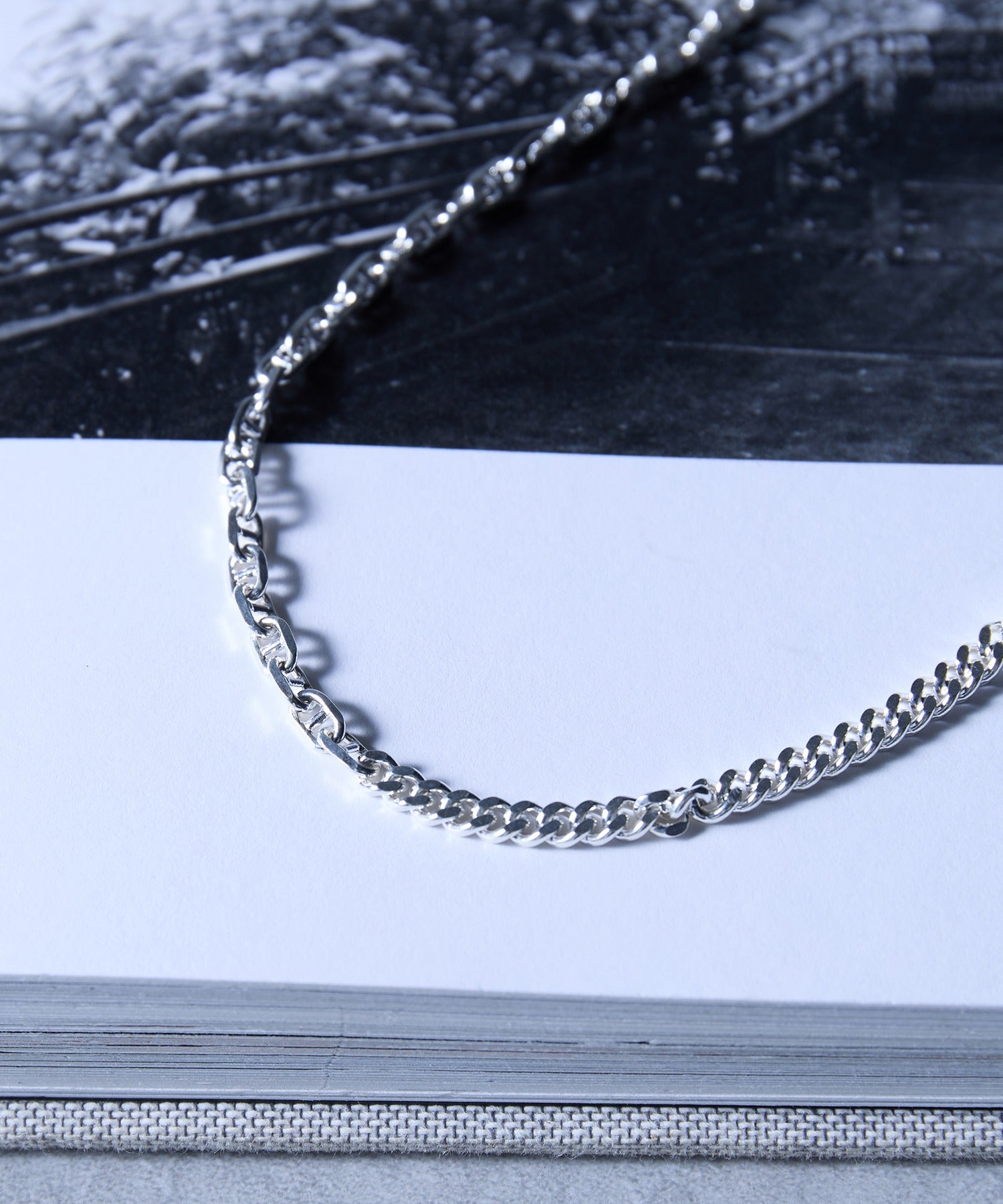 高品質なSilver925素材を採用した、アンカーチェーンと華奢なチェーンのコンビネーションが魅力のネックレスです。チェーンの片側は、船の錨(いかり)をモチーフにしたアンカーチェーンで、適度なボリュームと存在感があります。もう片側は、繊細な輝きを放つ細身のチェーンで構成されており、この異素材のコントラストが胸元に洗練された表情を生み出します。シンプルな着こなしに加えるだけで、一気にトレンド感をプラスできる万能なアイテムです。