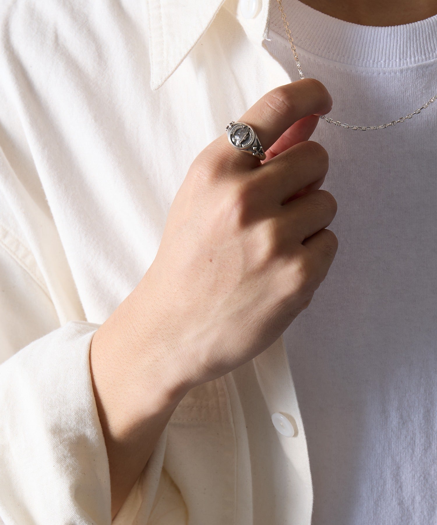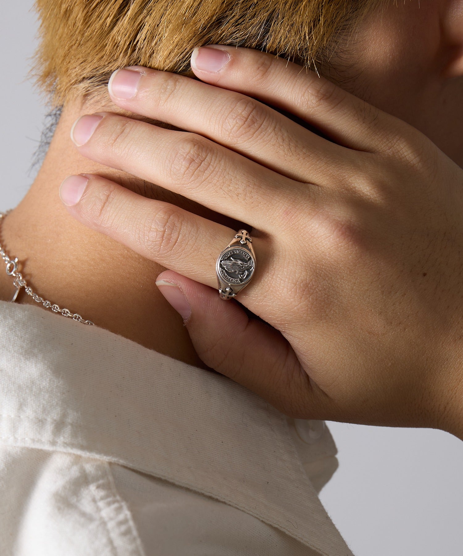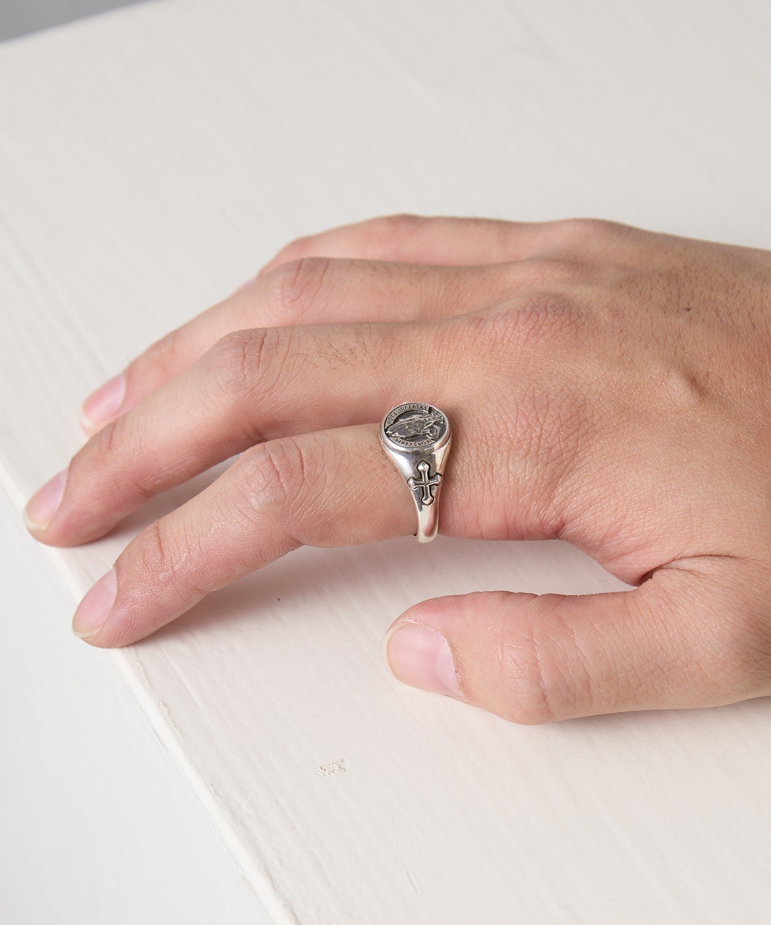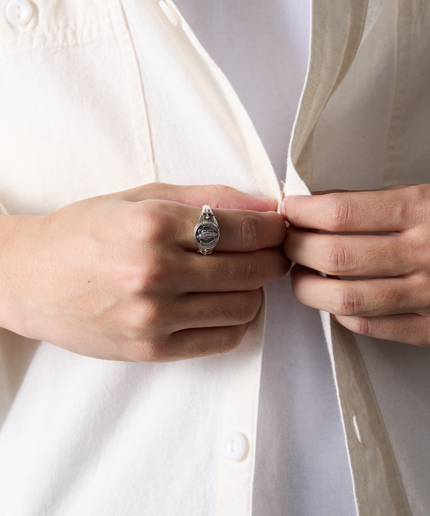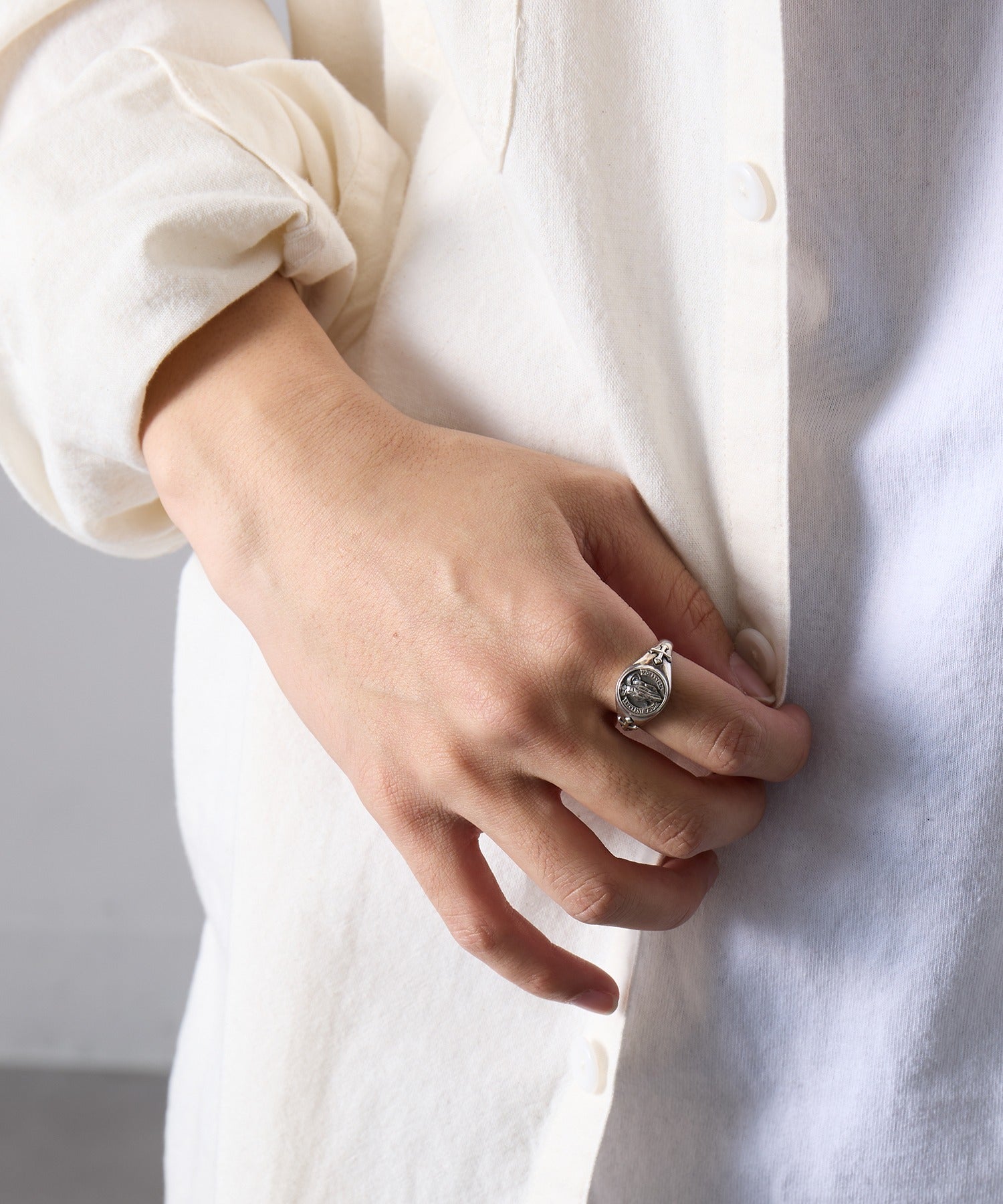 クラシカルなメダイモチーフが手元に存在感を放つ、上質なシルバーリング
