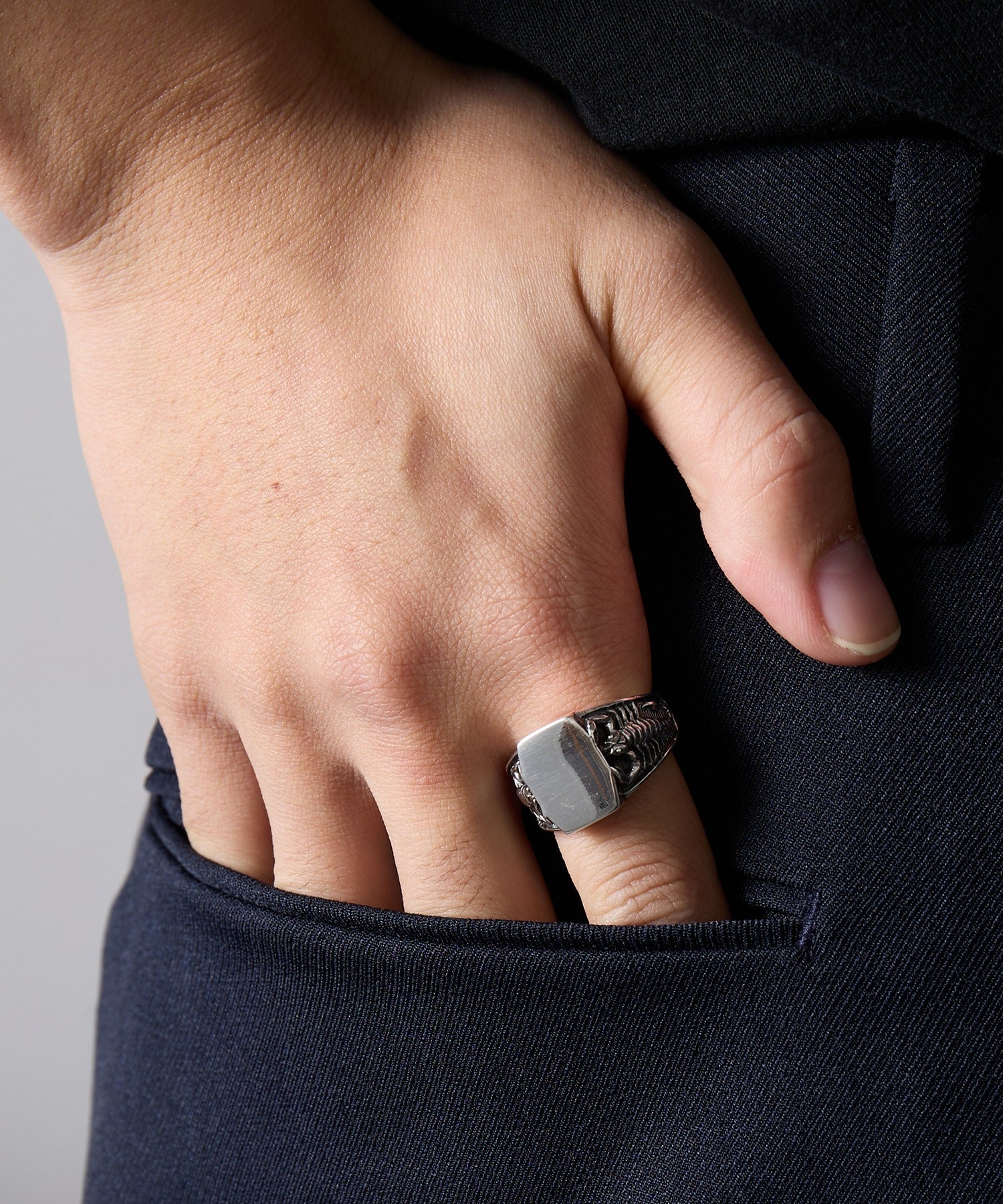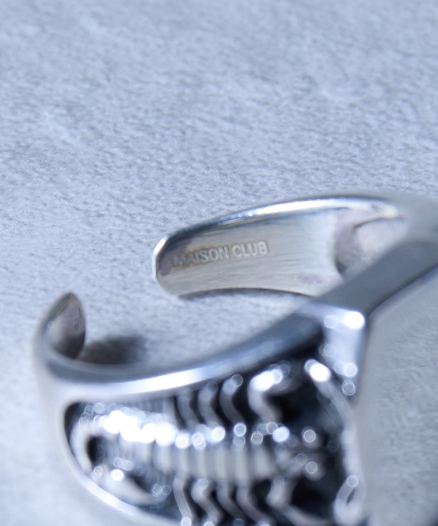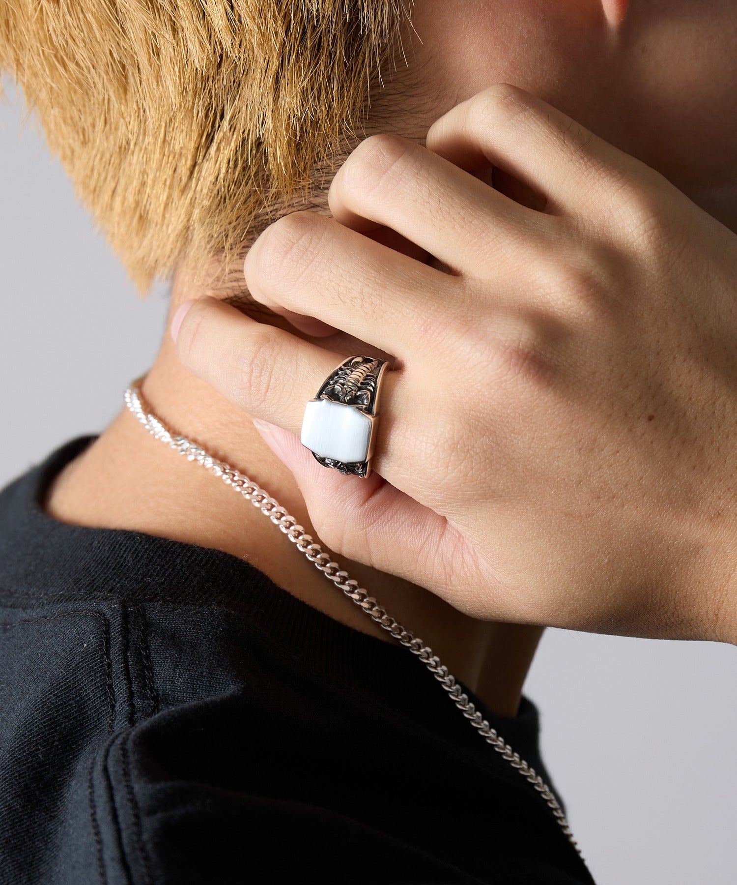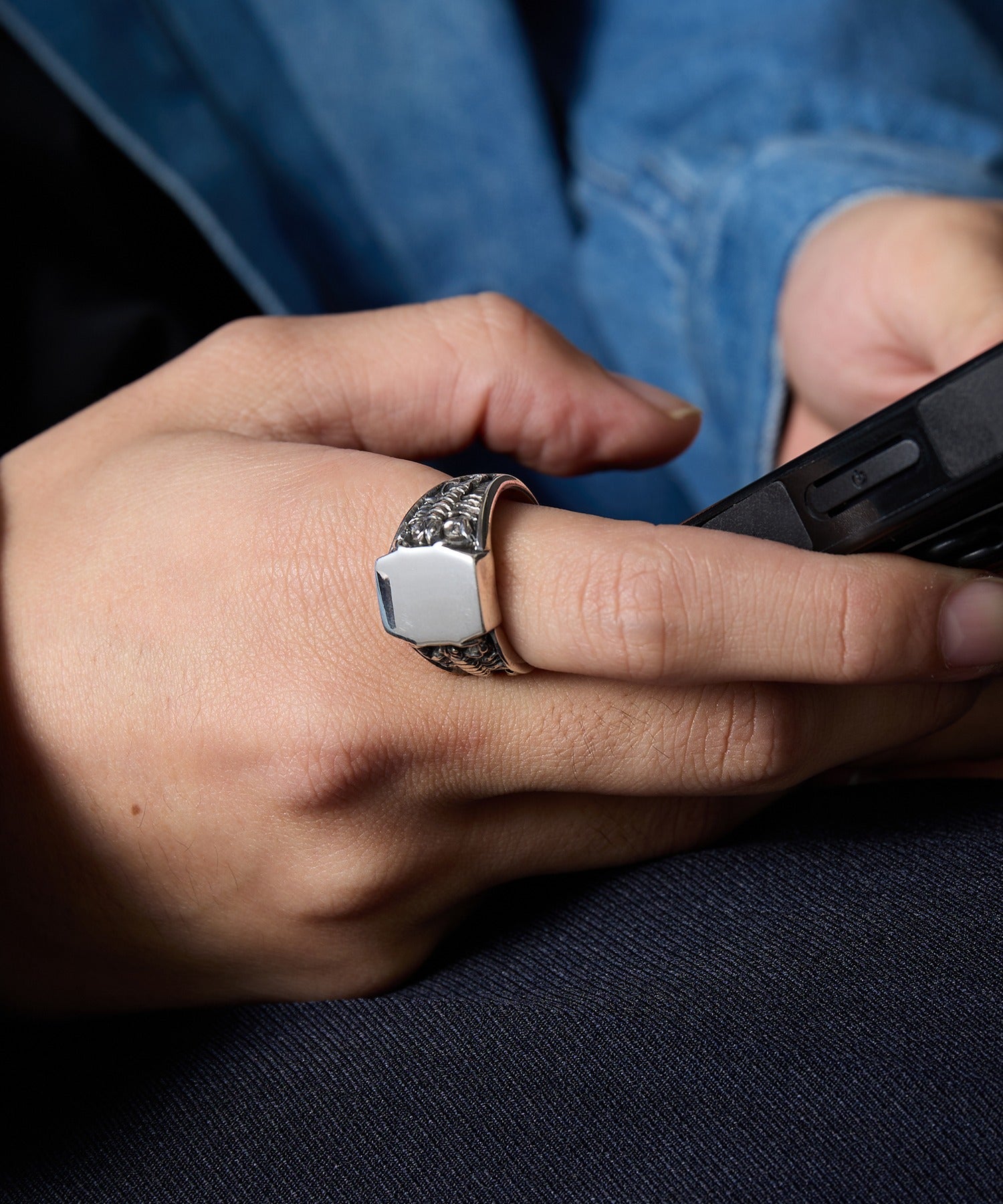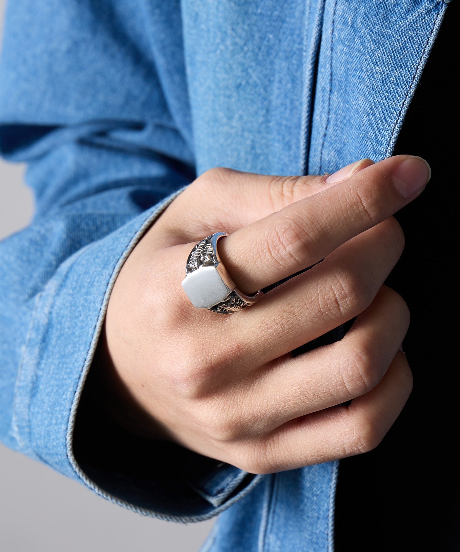 滑らかな光沢と彫刻のようなディテールが織りなすコントラストが印象的で、手元に個性と力強さをプラス。