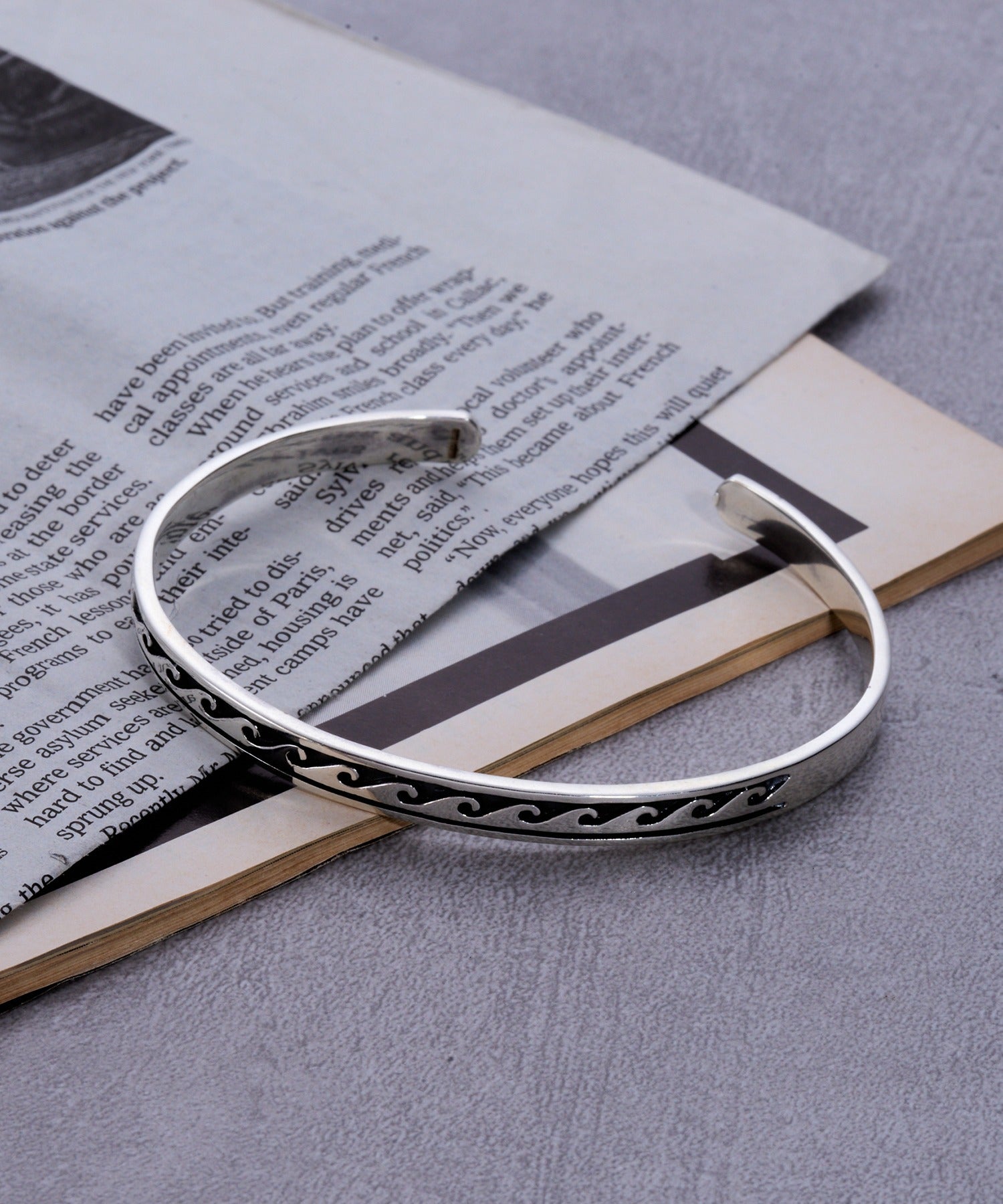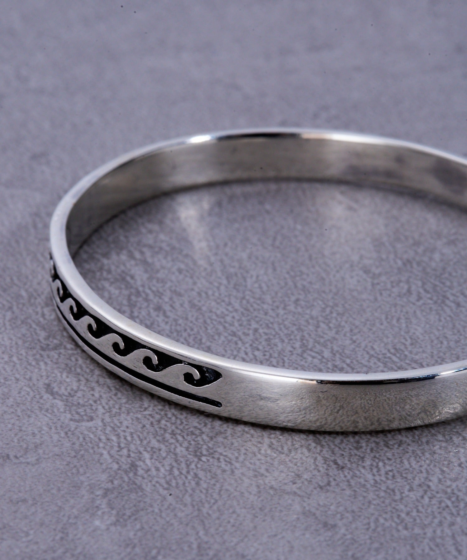 細部までこだわった精巧な波柄デザインが魅力のバングルです。