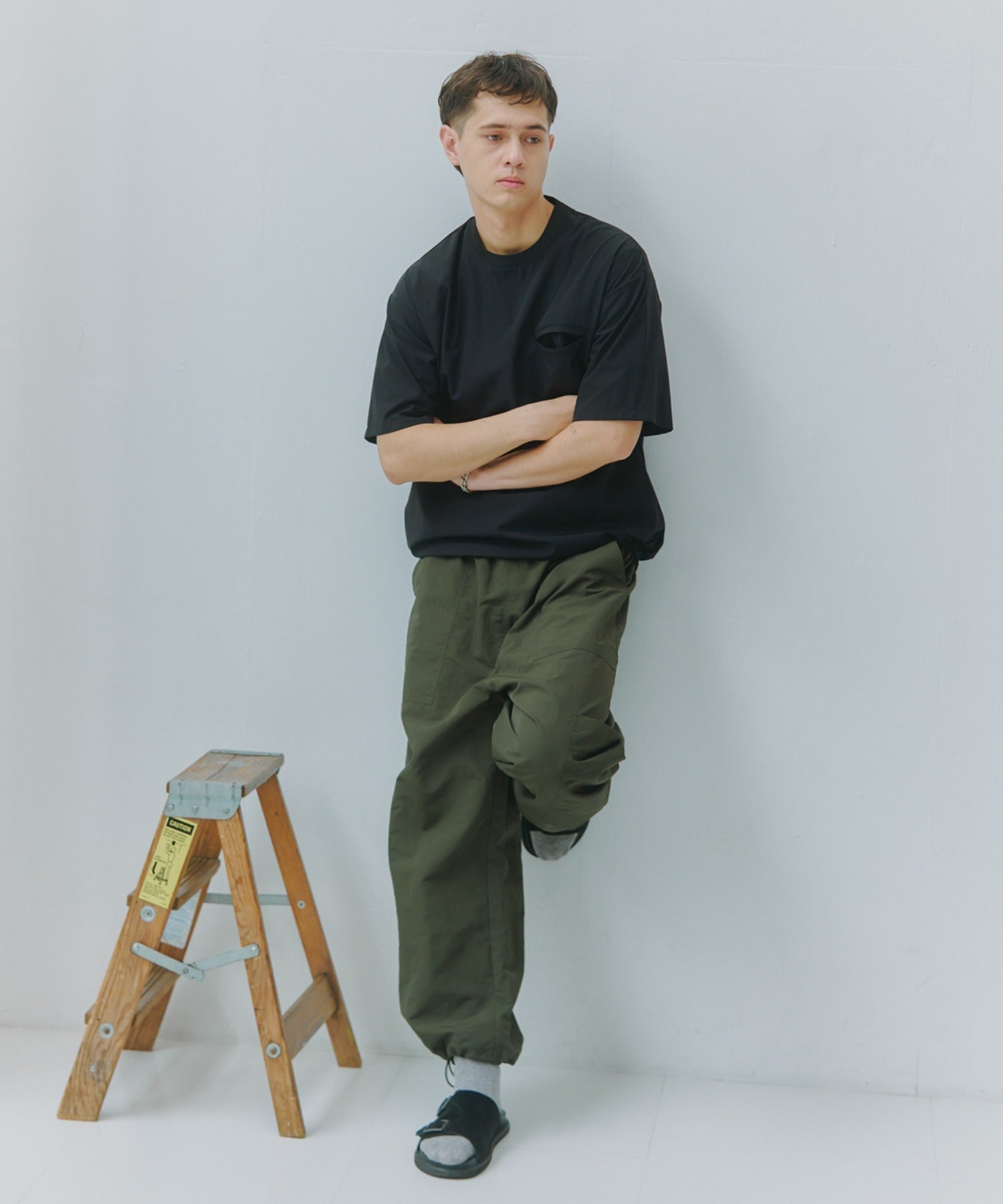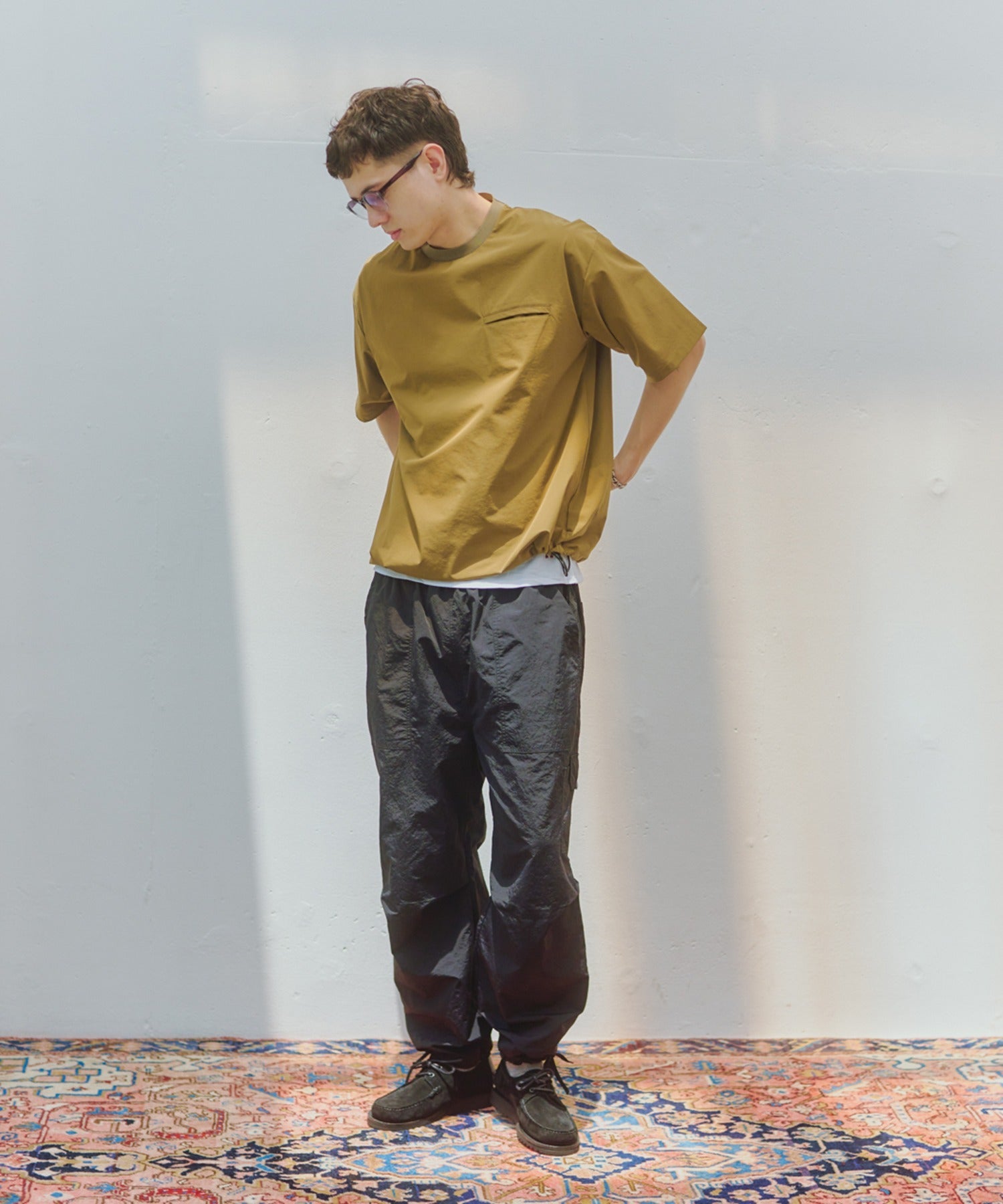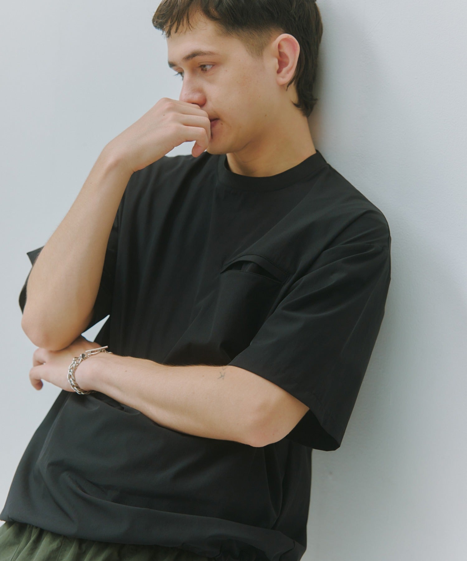 胸元には同色のポケットをワンポイントに、裾にはドローコードを配しており、スタイリングに合わせてシルエットの調整も可能。