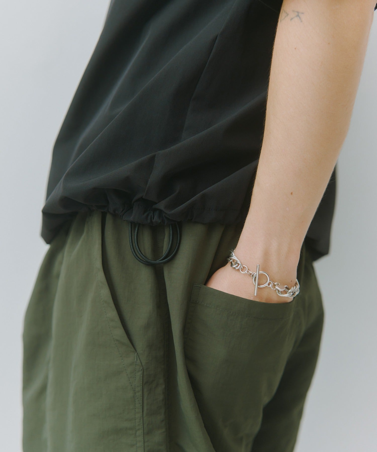 ドローコードで裾を絞り、丸みをつけることで、シルエットに軽やかな変化を加えるのもおすすめです。