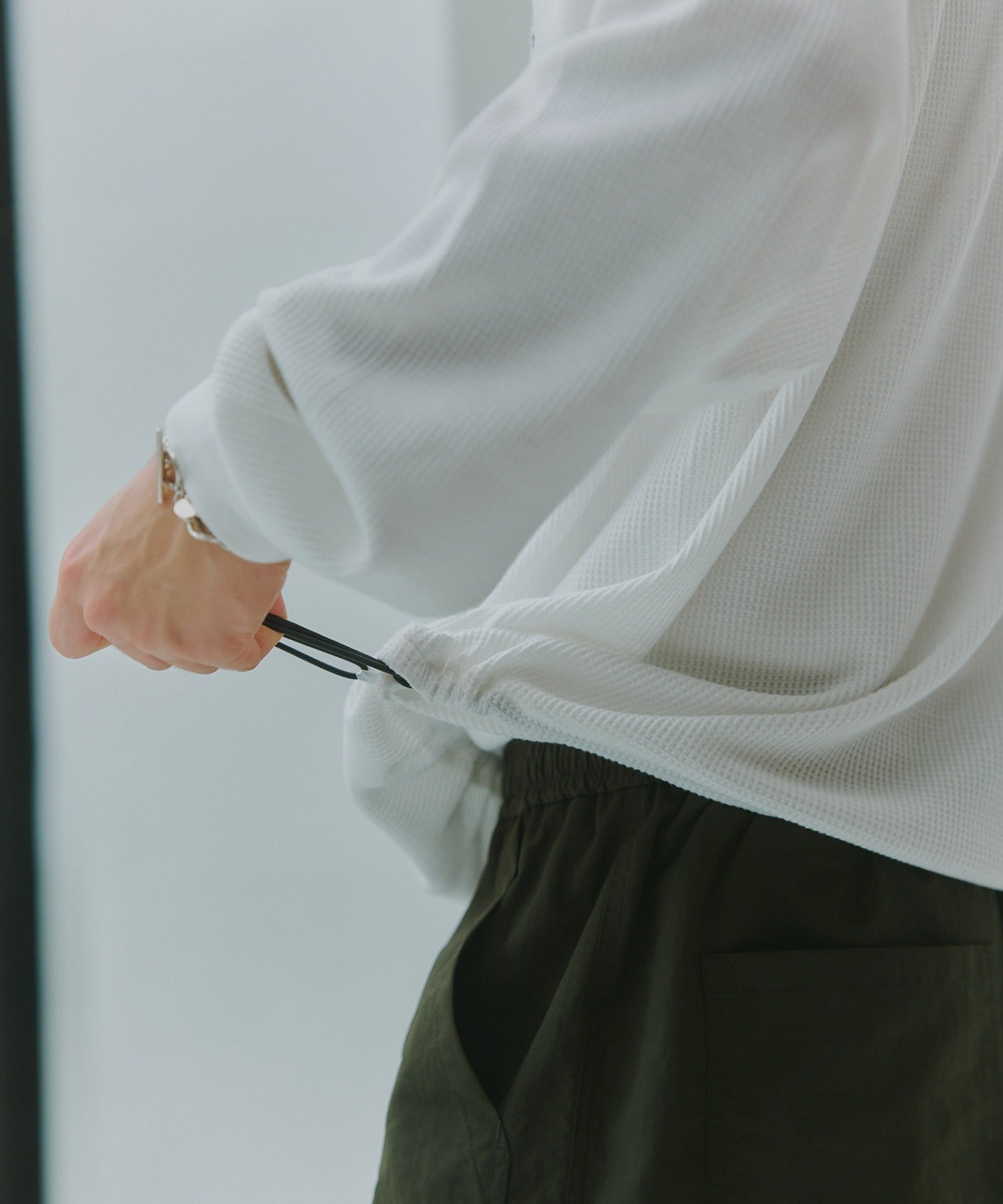 控えめながら芯のある表情を、素材の奥行きに静かに重ねています。裾にはドローコードを配しており、絞ることで丸みのあるシルエットやコンパクトな丈感にも調整可能。